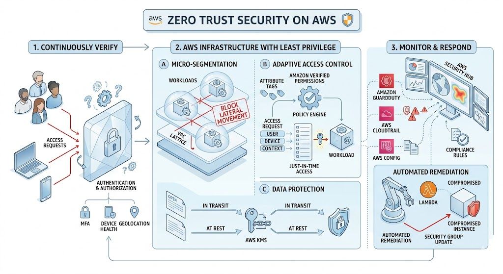 Before we geek out on AWS services, here’s the mental model. Zero Trust boils down to a few non-negotiable ideas: